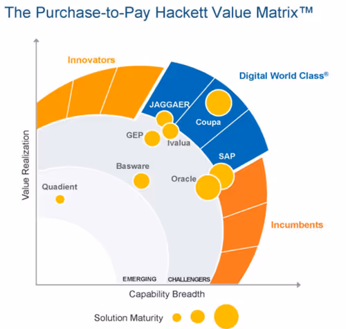 This year, The Hackett Group also assessed P2P software solutions based on their benchmark data. We already know these kinds of quadrants from Gartner and Forrester. What sets The Hackett Group's assessment apart is that they use benchmark data to measure value realization. So it's interesting to follow them.